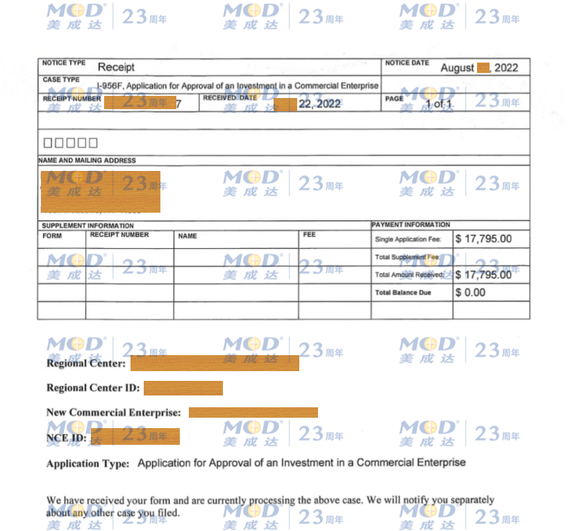 項(xiàng)目已經(jīng)收到美國移民局發(fā)出的I-956F回執(zhí)