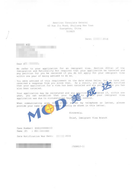 同時,很不幸的是,Z女士于2016年4月5日收到來自美國駐廣州總領(lǐng)事館的通知,該通知說根據(jù)《移民與國籍法》的第203(e)條款,Z女士和女兒的F1移民申請已經(jīng)被取消,并且涉及到的一切相關(guān)申請也已經(jīng)被取消。得知這個消息后,Z女士和女兒就如晴天霹靂,生活從此失去了方向。