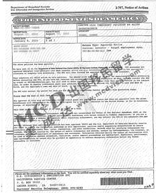 根據(jù)每位顧客的實際情況美成達為顧客提出最合適的建議,制定最合適的方案,是美成達每一個成功案例的基礎(chǔ)保障。只有選擇合適的才是最重要的,這句話在很多領(lǐng)域都是通用的。我們的信念是:美成達服務(wù),讓您真正放心、開心。(下圖為吳先生的I-526批準函)